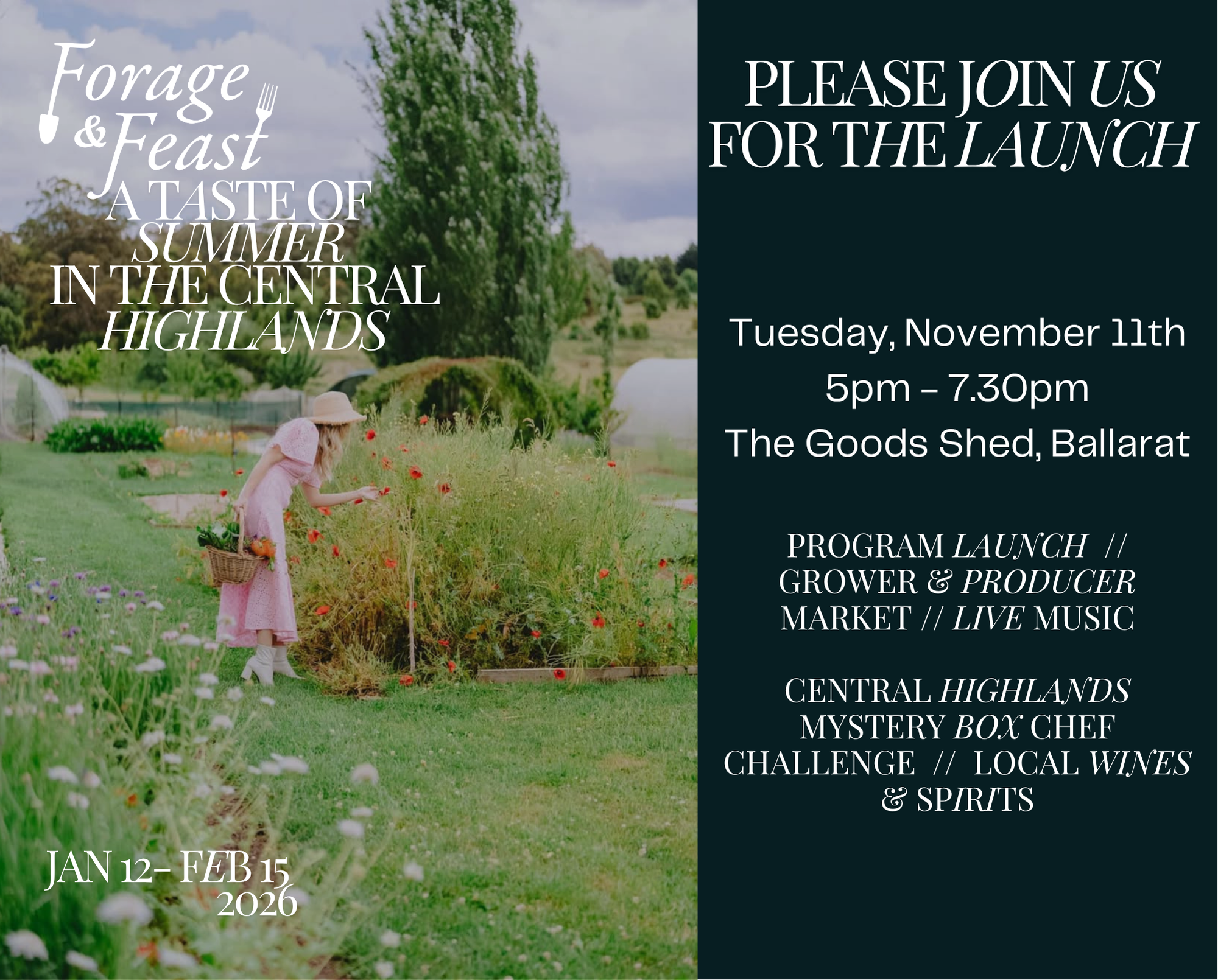 Join us at the Forage & Feast Launch Event November 11th! This evening event marks the official unveiling of the 2026 Forage & Feast Festival Program—a curated celebration of regional dining, storytelling, and seasonal experiences across the Central Highlands running from Jan 12 - Feb 15. You’ll get a first look at the venues, producers, and events featured in the campaign, alongside a showcase of food and drink from across the region. We look forward to welcoming you both to our event and to new discoveries.